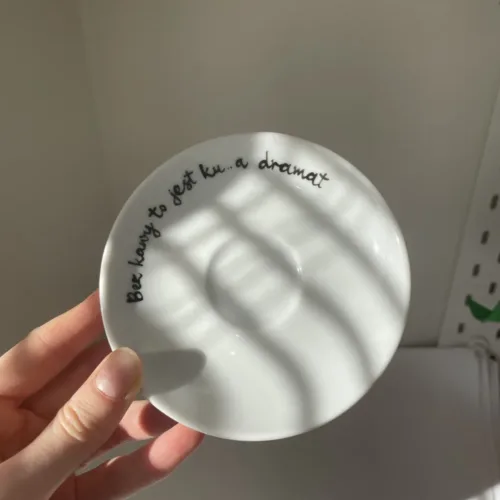Na filiżance możesz umieścić napis do 5 słów – zarówno na przodzie, jak i na tyle naczynia. Dodatkowo istnieje możliwość personalizacji spodka: napis na jego brzegu lub w kółku pod filiżanką. Wybierasz styl czcionki (odręczna lub drukowana) oraz opcjonalne serduszko w wybranym kolorze, dzięki czemu filiżanka będzie w pełni odpowiadać Twoim oczekiwaniom.
