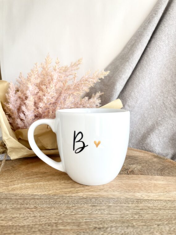 Kubek z monogramem to wspaniały personalizowany pomysł na prezent, także dla siebie :). Kaligrafowana litera ze złotym serduszkiem wyglada bardzo elegancko.
